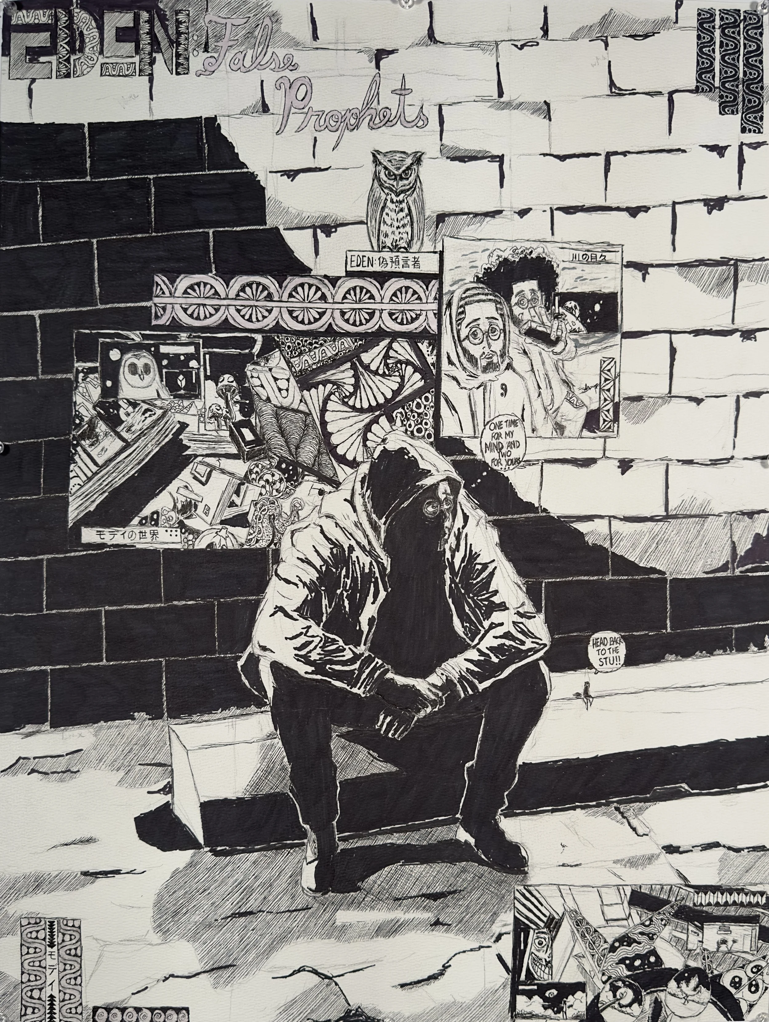 Michael D. King Jr., also known as Modius Modi (b. Detroit, MI, 2001), is an interdisciplinary artist with a BFA in Drawing from Saginaw Valley State University and is currently pursuing his MFA in Fine Arts at the University of Michigan. His work is rooted in the “EDEN” series, an exploration deeply inspired by the nuances of the human condition. Drawing influence from anime, manga, classic art, music, cinematography, and philosophy.